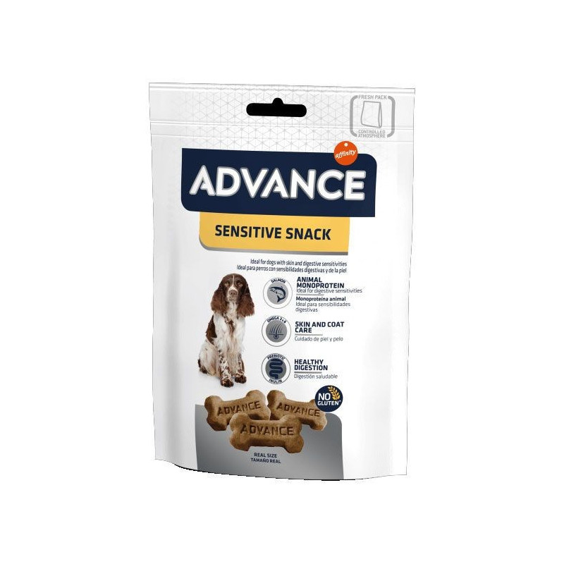 ADVANCE Sensitive Snack es una galleta tierna y apetitosa ideal para perros con la piel y el tracto digestivo delicados. Su fórmula, con salmón como única fuente de proteína animal, favorece la digestión. Además contiene inulina para una digestión saludable de tu perro y Omega 3 y 6, que contribuye a la salud y protección de su piel.