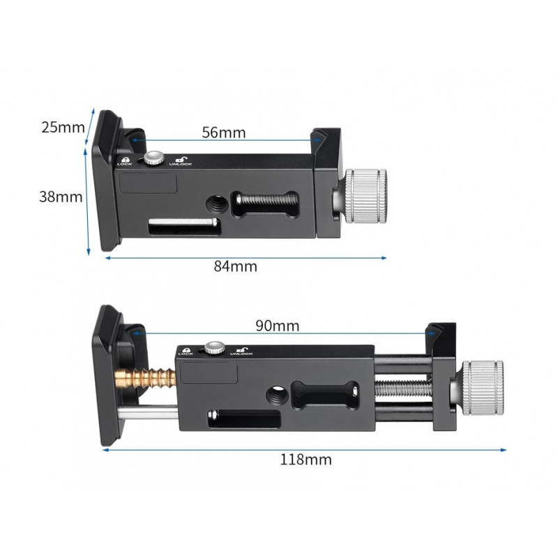Este es un pinza universal para Smartphone con rosca 1/4 realizada en aluminio anodizado y maquinaria CNC para máxima precisión.