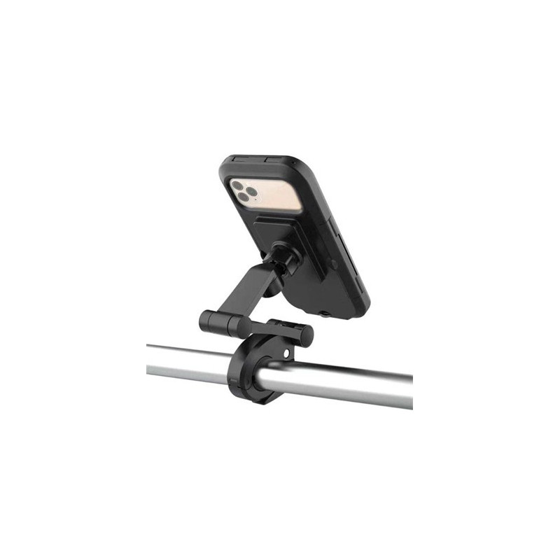 Soporte para teléfono móvil Andowl para motocicletas. El soporte se fija al manillar de la motocicleta mediante un adaptador ajustable. El dispositivo se apoya en la base con una funda. Esto lo protege del agua, el polvo y el viento. Además, es giratorio para ajustarlo fácilmente a la posición deseada.