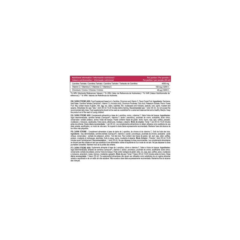 Ingredientes: L-Carnita Tartrato (Carnipure), Vitamina C, Cromo Picolinato. Agua desmineralizada, Acidulante.