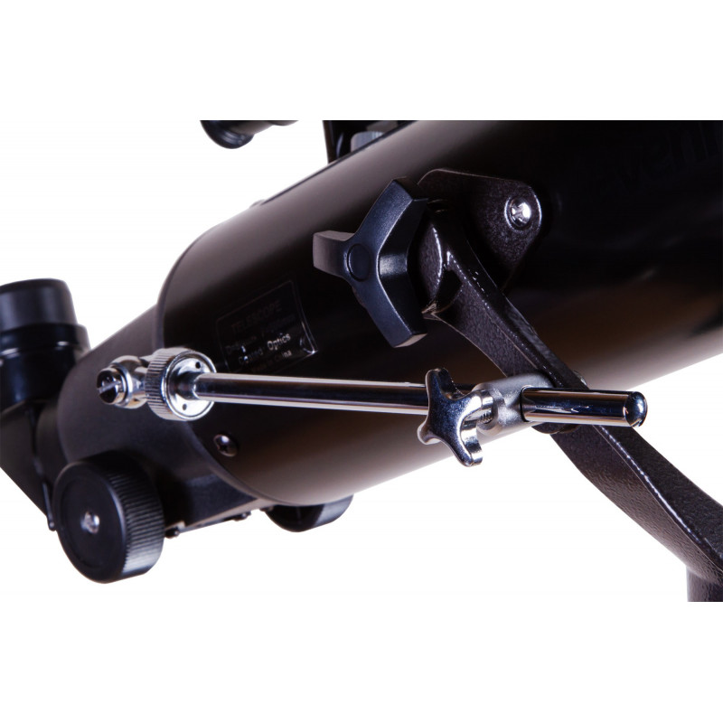 Las lentes del telescopio están hechas de vidrio. Las superficies exteriores están protegidas con un revestimiento antirreflectante que mejora el brillo de la imagen. La óptica ofrece una imagen nítida y contrastada y permite observar incluso objetos tenues en el cielo estrellado. El telescopio está montado en una montura de azimut alternativo fácil de usar. Incluso un niño puede operar este telescopio: para apuntar un tubo óptico a la posición deseada, gírelo a lo largo del eje horizontal o vertical. Un soporte se fija fácilmente en un trípode de aluminio. Es robusto y confiable. El trípode tiene patas ajustables. Hay una bandeja de accesorios que se puede acoplar al trípode.