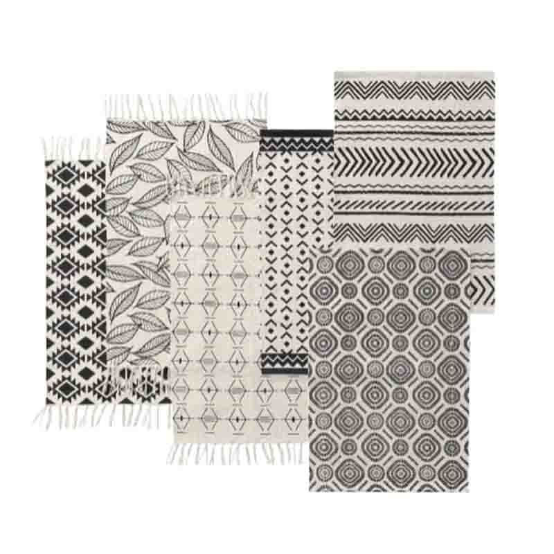 Alfombras con diseńo de patrones geométricos y naturales en tonos blanco y negro. Fabricadas en polialgodón, tienen un tamańo ideal para espacios pequeńos o como elementos decorativos en áreas más grandes.Su diseńo minimalista las hace versátiles para diferentes estilos de decoración. PRECIO UNITARIO.