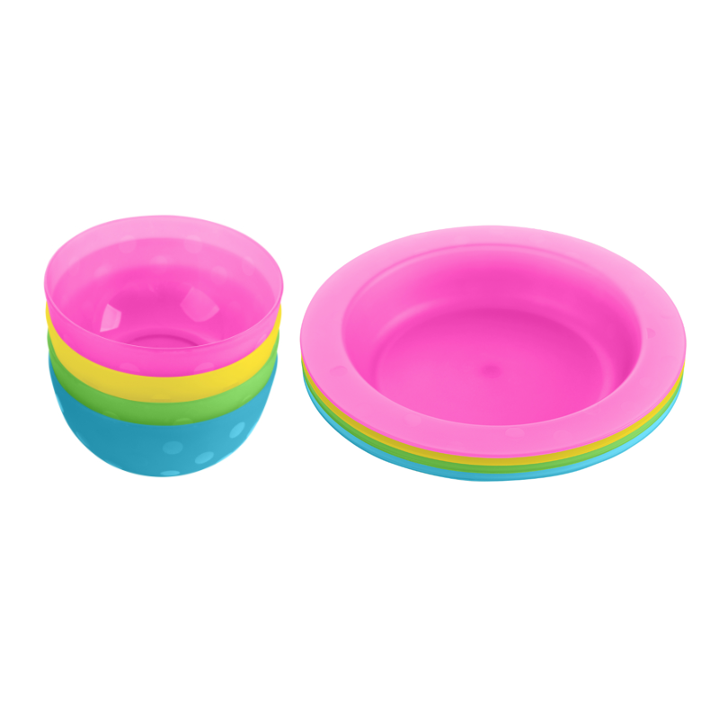 • Apto para niños a partir de 6 meses; • El juego incluye 4 cuencos y 4 platos • Capacidad cuenco 300ml; • Capacidad plato 400ml; • Material PP; • Sin BPA; Dimensiones: - Cuenco: 11x11x5.2 cm / 0.026 kg - Plato: 19.5x19.5x3 cm / 0.071 kg