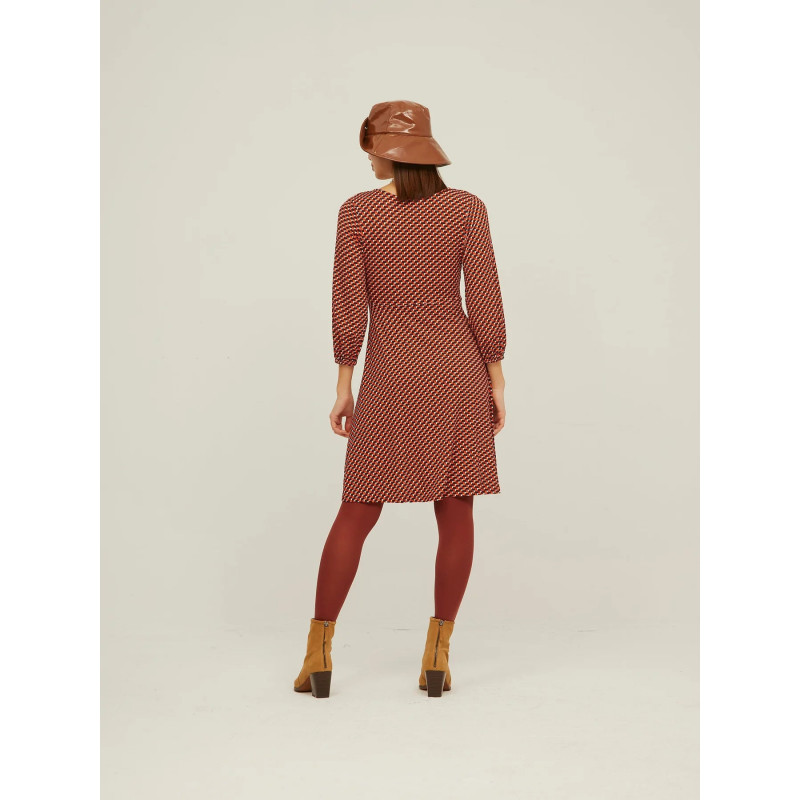 Vestido de manga larga en estampado Retro. Escote pico cruzado, largo por encima rodilla y corte evasé y detalle volante. Composición: Viscosa 95% Elastano 5%.