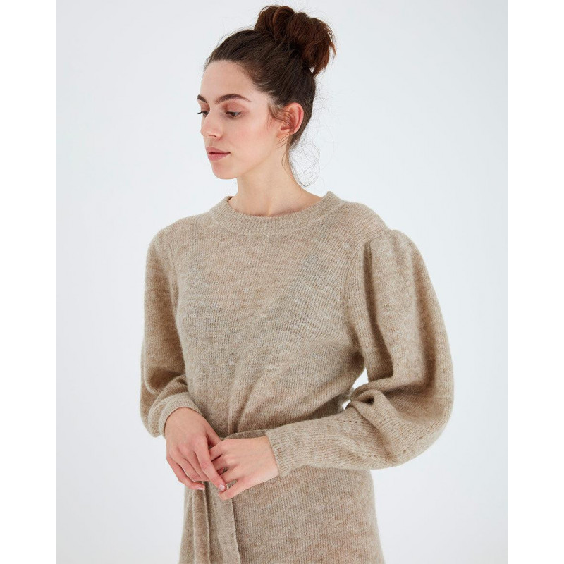 Vestido de punto. Tiene un largo midi, un cuello ligeramente alto y mangas largas. El vestido tiene un corte recto que se puede ajustar a la cintura con el cinturón de corbata incluido. Abertura larga en ambos lados. ¡Úselo solo o sobre jeans! Color beige Nombre del color del proveedor: Melange de avena Ajuste: recto Material: 57% nailon, 20% lana, 18% lana de mohair, 5% elastano Código del artículo: 2409510143
