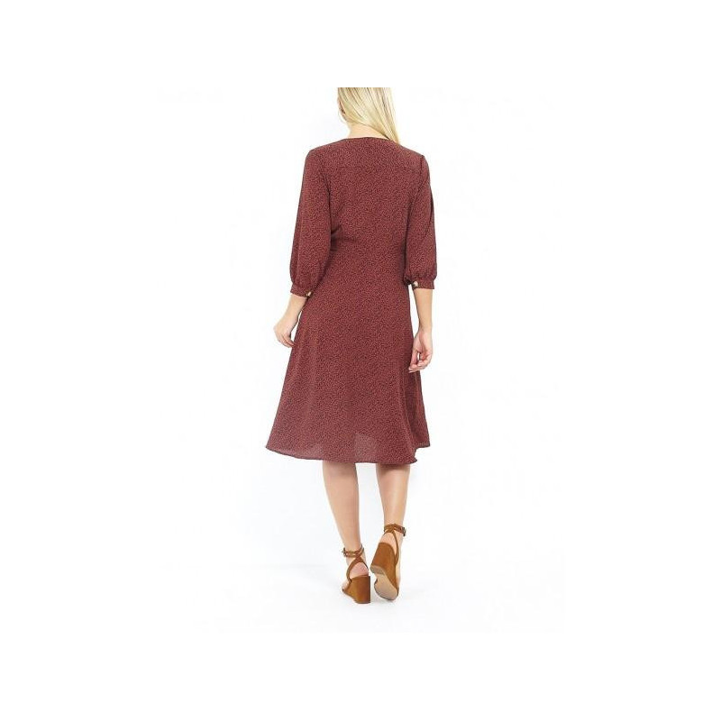 Vestido marrón cruzado y abotonado de manga tres cuartos.   95% poliéster 5% elastano