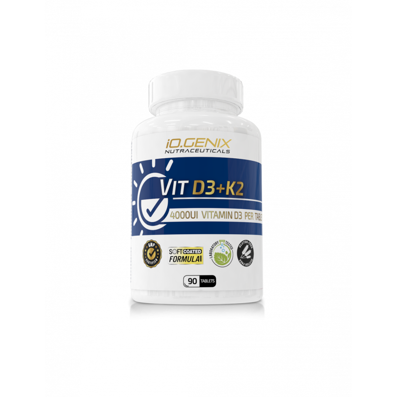 Vit D3+K2 de iO.GENIX es un complemento alimenticio a base de colecalciferol (vitamina D3) y menaquinona-7 (vitamina K2) en comprimidos recubiertos. Esta fórmula aporta 100 µg de vitamina D3 (4000 UI) y 150 µg de vitamina K2 por toma diaria. Con tamaño reducido de comprimido y fácilmente ingerible.