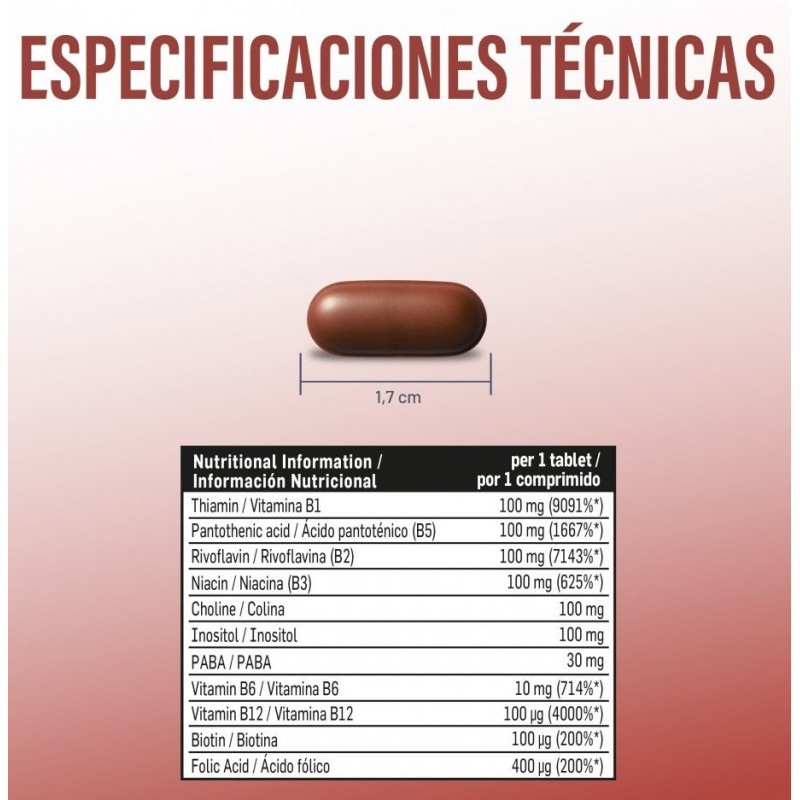 Nuestro B-Complex 100 aporta una dosis equilibrada de B1, B2, B3, B5, B6, B7, B9 y B12, además de colina, inositol y PABA, tres compuestos que optimizan la absorción y eficacia de las vitaminas B en el cuerpo.