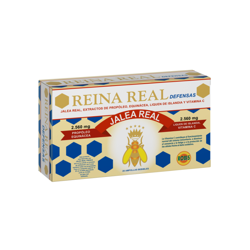 Complemento alimenticio con jalea real, extractos de propóleo, equinácea, liquen de islandia, que puede contribuir al buen funcionamiento del sistema inmunitario, la disminución del cansancio y la prevención del estrés oxidativo.