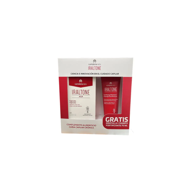 Iraltone pack Aga 60 cápsulas + champú 75 ml es un tratamiento para ayudar a prevenir la caída del cabello que se administra por vía oral y tópica. ...
