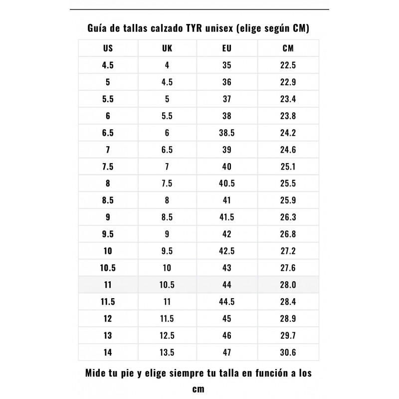 La CXT-2 incorpora múltiples características avanzadas que optimizan tu rendimiento durante el entrenamiento. Este calzado ofrece una base sólida y reactiva que responde eficazmente a la energía que aplicas en cada movimiento. Utilizado por atletas de élite en los CrossFit Games y competiciones de alto nivel, TYR garantiza calidad y confianza. Las tallas las tenemos puestas en centímetros, que es como se tiene que medir un calzado de entrenamiento. Consulta tu talla habitual en la lengueta de tu zapato o mídete el pie si quieres afinar aún mejor.   Detalles: * Drop en el talón de 7 mm. * Protector de puntera extendido para mayor durabilidad y tracción. * Construcción de malla transpirable. * Lengüeta suave y duradera en el talón para un deslizamiento sin esfuerzo durante los HSPU. * Flexible en el antepié para movimientos explosivos y ágiles. * Estabilidad en la talonera para un control y contacto con el suelo perfectos. * Acolchamiento extra en lengüeta y talón para una comodidad superior.
