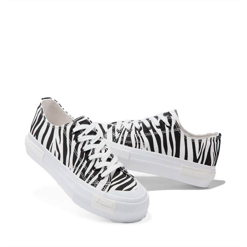 Este modelo de corte recto está construido en textil lona con un diseño de zebra. Suela de goma blanca y lettering personalizado en el talón. Presenta una altura de 4 cm y cuenta con el emblema de nuestra bandera en el lateral.