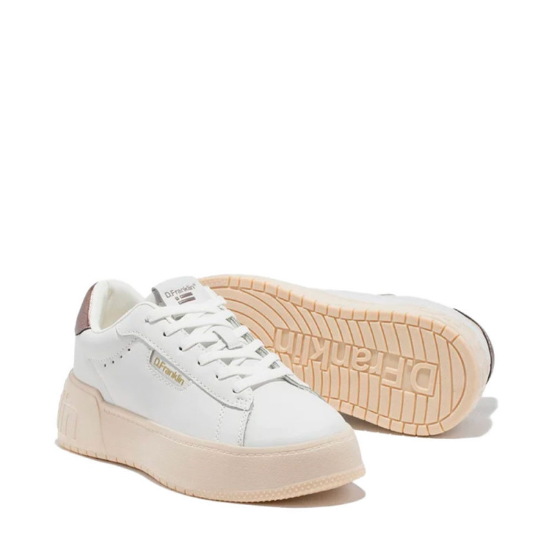 Zapatillas minimal con inspiración deportiva. El diseño referente de nuestra iconografía traspasa la cancha y llega hasta las calles. Conecta tu estética D.Franklin con un emblema de corte retro y detalles sencillos.