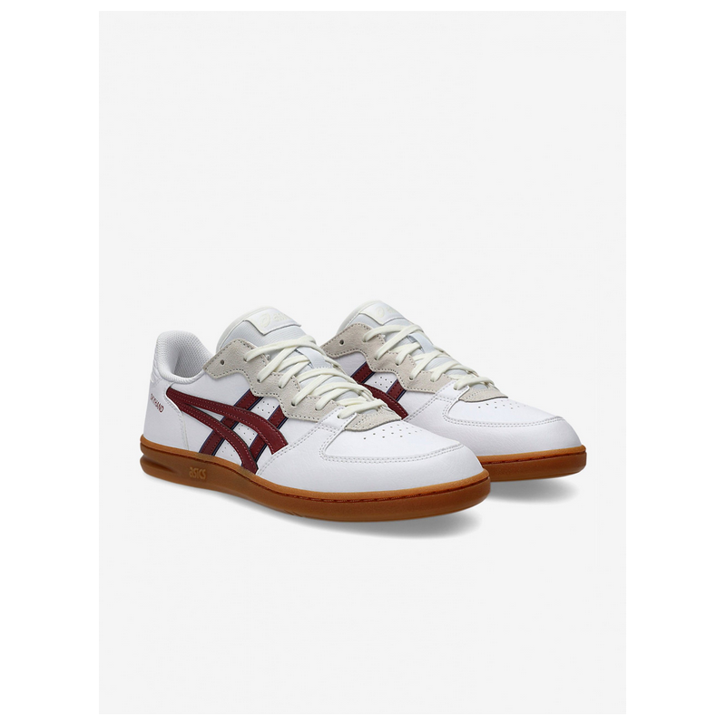 Zapatillas Asics Skyhand OG Blancas y Burdeos fabricadas con piel y materiales sintéticos y textiles con parte superior en una combinación de piel lisa y paneles de gamuza, amortiguación FLYTEFOAM PROPEL diseñada para absorber el impacto de forma cómoda, talón con refuerzo de EVA para mayor sujeción y suela de goma.