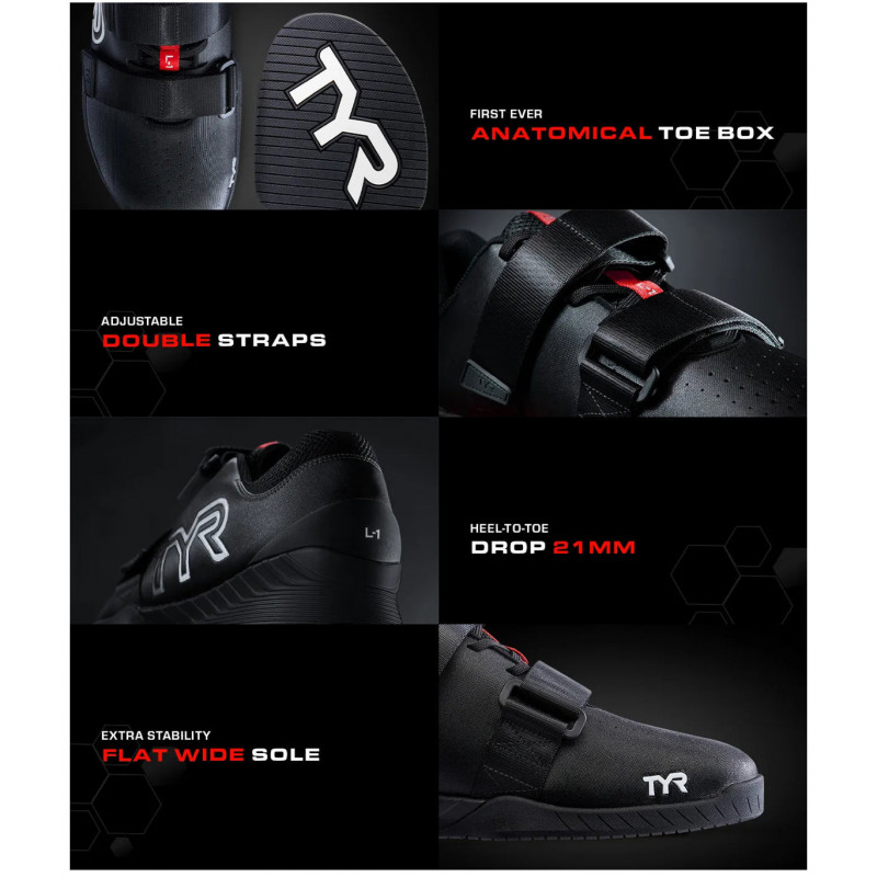 Mantente firme y potencia tu fuerza con las zapatillas de halterofilia L-1 de TYR. Son las zapas de haltero más anatómicas del mercado, lo que te permite un movimiento natural del pie y mayor potencia. Además, el drop de 21 mm del talón a la punta del pie profundiza los movimientos y aumenta la estabilidad. ¿Por qué tienes que comprar estas y no otras? ✅ El levantado del talón es lo suficientemente alto para el equilibrio y cómodo a la vez para la estabilidad. ✅ Las correas de velcro están en los dos sentidos para ofrecer mayor sujeción a tu gusto. ✅ La pisada es natural y amplia, lo que hace que te sientas estable en todo momento. Si quieres mejorar tus movimientos de halterofilia, la L-1 de TYR es tu zapatilla. Además, tenemos disponible más colores bajo pedido.   Detalles: * Drop de 21 mm del talón a la punta del pie, que permite una postura más erguida en los levantamientos y mejora la profundidad en las sentadillas. * Soporte del talón trasero. * Puntera más amplia para un ajuste natural y sin restricciones, brindando comodidad y potencia en los levantamientos. * Doble correa ajustable en el mediopié para asegurar la posición del pie. * Suela plana y ancha para una estabilidad adicional.