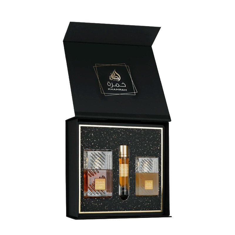 El Lattafa Khamrah 3 pcs Gift Set combina una fragancia Eau de Parfum de alta intensidad con complementos aromáticos para una rutina olfativa completa. Esta composición oriental especiada ofrece una firma profunda y envolvente que mezcla matices cálidos, amaderados y dulces, evocando sofisticación, misterio y presencia duradera.