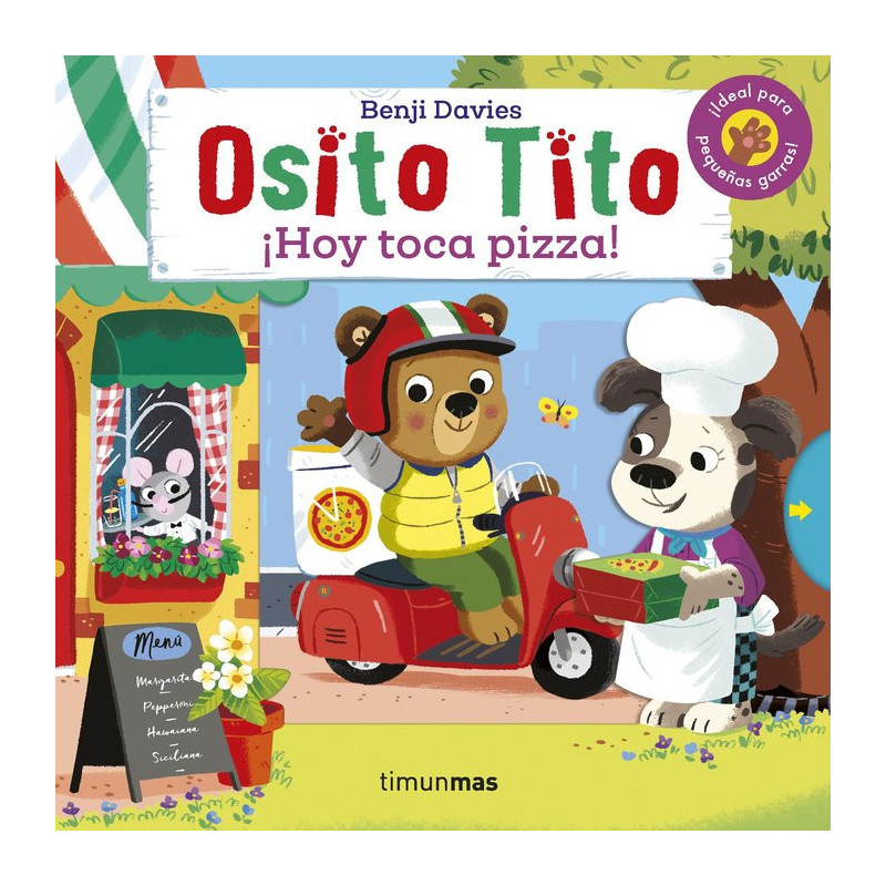 En esta nueva aventura, ¡Osito Titoáse convierte en chef! ¡Ayúdalo a preparar una pizza en este divertidísimo libro con mecanismos para estirar! Corta los tomates, prepara la masa, elige los ingredientes y sube a la moto para traerla a casa. ¿Hay algo que este Osito no sepa hacer?¡Un libro ideal para niños y niñas a partir de 1 año!Títulos de la colección Osito Tito: El gran libro de Osito TitoOsito Tito. Libro y pelucheOsito Tito. Juega y construyeOsito Tito. ¡Hoy toca pizza!Osito Tito. Estrellas del balónOsito Tito. ¡Todos al tren!Osito Tito. ¡Vamos en avión!Osito Tito. Un día en el castilloOsito Tito. ¡Vamos a construir!Osito Tito. La gran carreraOsito Tito. ¡Manos a la obra!Osito Tito. Emergencia al volanteOsito Tito. Vamos de viajeOsito Tito. La casa encantadaOsito Tito. Misión espacialOsito Tito. ¡Vamos al zoo!Osito Tito. Aventura pirataOsito Tito. Bomberos al rescateOsito Tito. Un día en la granjaOsito Tito. ¡Vamos a jugar!Osito Tito. Aventura submarinaOsito Tito. Safari de dinosauriosOsito Tito. Un día en la nieveOsito Tito. ¡Feliz Navidad!