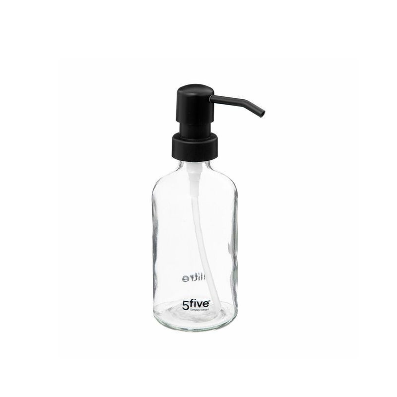 Sencillo dosificador de cristal transparente lo que te permitirá ver la cantidad de producto que queda.De sencillo diseńo combina perfectamente en cualquier bańo.