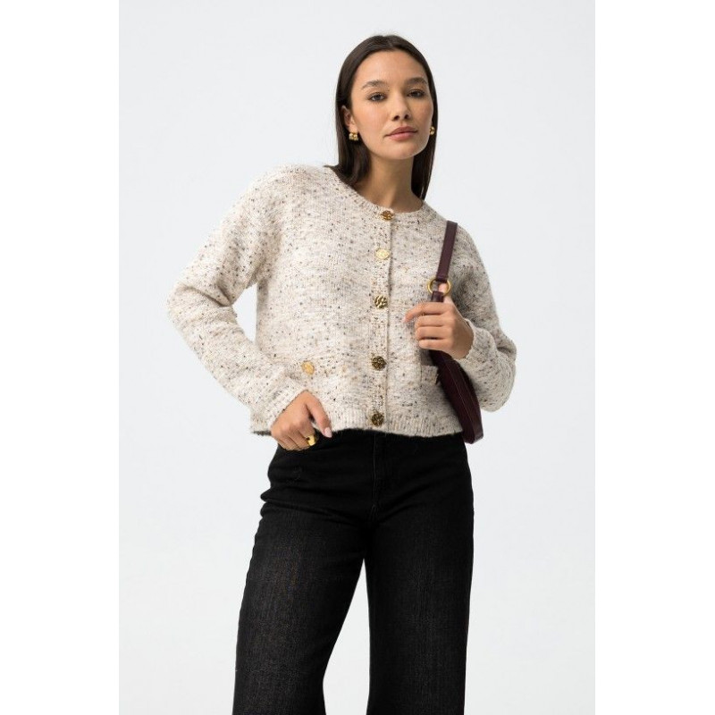 Cárdigan jaspeado de tacto suave y estructura cálida, perfecto para el día a día. Su diseño recto y ligeramente corto aporta un estilo actual sin perder comodidad. Los botones frontales con acabado grabado y los bolsillos delanteros le dan un toque práctico y distintivo. * Color: Beige jaspeado con motas en tonos marrón, gris y negro * Tejido: Punto suave y cálido de mezcla sintética * Corte: Recto y ligeramente corto * Cuello: Redondo * Cierre: Botones frontales con relieve * Bolsillos: Dos bolsillos delanteros * Acabado: Textura gruesa y confortable