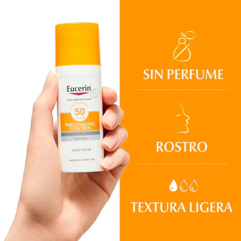 Eucerin Sun Fluid Photoaging Control FPS 50 no contiene fragancias y tiene una agradable textura ligera que se absorbe rápidamente. Los estudios clínicos y dermatológicos han demostrado una muy buena tolerabilidad en pieles sensibles.