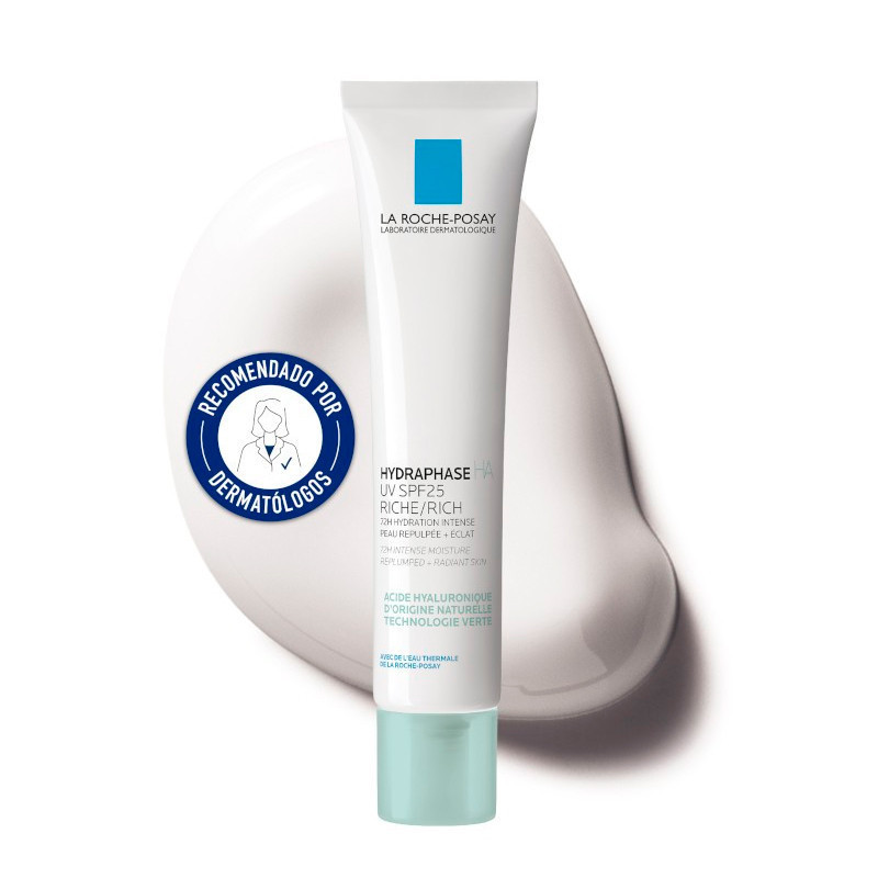 Hydraphase HA UV Rica de La Roche-Posay es una crema facial hidratante intensiva diseñada para pieles sensibles y secas. Enriquecida con ácido hialurónico puro de origen natural, agua termal calmante y una protección antioxidante con vitamina E y filtros UV SPF 25, proporciona una hidratación duradera de hasta 72 horas