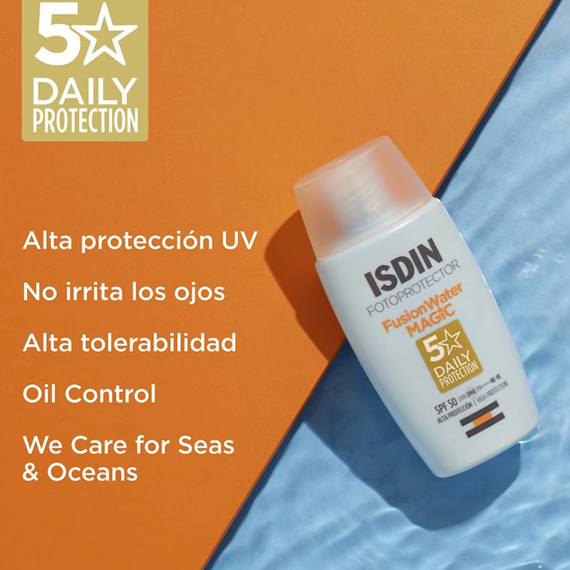 Fotoprotector Fusion Water MAGIC SPF 50 de ISDIN es un fotoprotector facial ultraligero de absorción inmediata y uso diario. Diseñado para fundirse con la piel, ofrece una alta protección contra la radiación solar, hidrata y proporciona acción antioxidante. Ideal para actividades al aire libre, este protector solar es adecuado para todo tipo de piel, incluyendo piel grasa, gracias a su fórmula oil control.