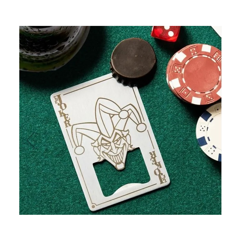 Abrebotellas de metal con forma de naipe grabado con láser.
