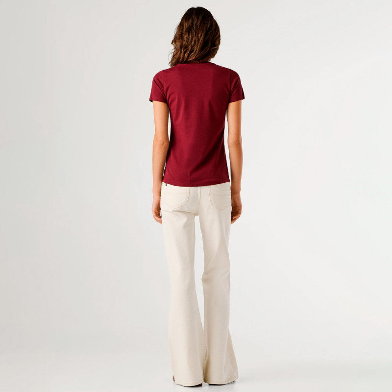- Corte: Manga corta y cuello redondo con detalle acanalado (canalé).